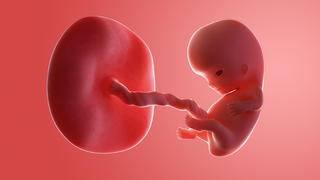 Composite. One side shows a foetus attached to a developing placenta by the umbilical cord. The forming head, eyes, arms and legs are now recognisable. Other side shows an adult hand with a raspberry in its palm.