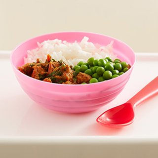 9. Serve ¼ of the curry in a bowl with a spoon or fork, with the rice and the cooked peas on the side as a finger food.