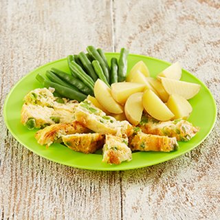 Your baby will love tucking into these little pots of cheesy veg omelettes, served with potatoes and green beans. They can be a great lunch to whip up for the whole family too. For over-5s, simply swap to reduced-fat hard cheese.