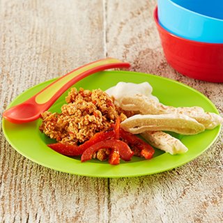These chicken strips marinated and stir-fried with pepper and onions are a great introduction to spices for your baby. Serve with pitta bread strips. This recipe is great for older members of the family, just put the fajita mix in tortillas.
